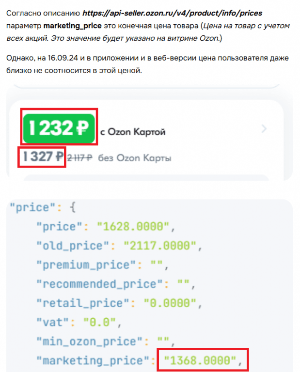 Дополнительно на форуме разработчиков Ozon подтверждается, что цены, которые видит покупатель, по API не отдаются, и хотя поле marketing_price присутствует.