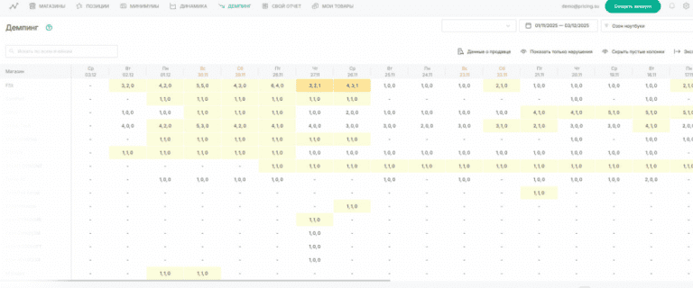 - Демпинг детальный — ссылки на карточки, тип цены, глубина отклонения.